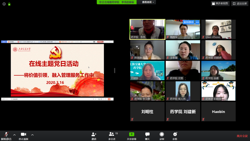 3月16日下午,管理服务党支部以视频会议的形式组织开展了3月份主题党日活动。本次会议以“将价值引领,融入管理服务工作中”为主题,全体党员通过ZOOM平台参加会议,会议由支部书记李伟主持。