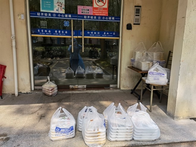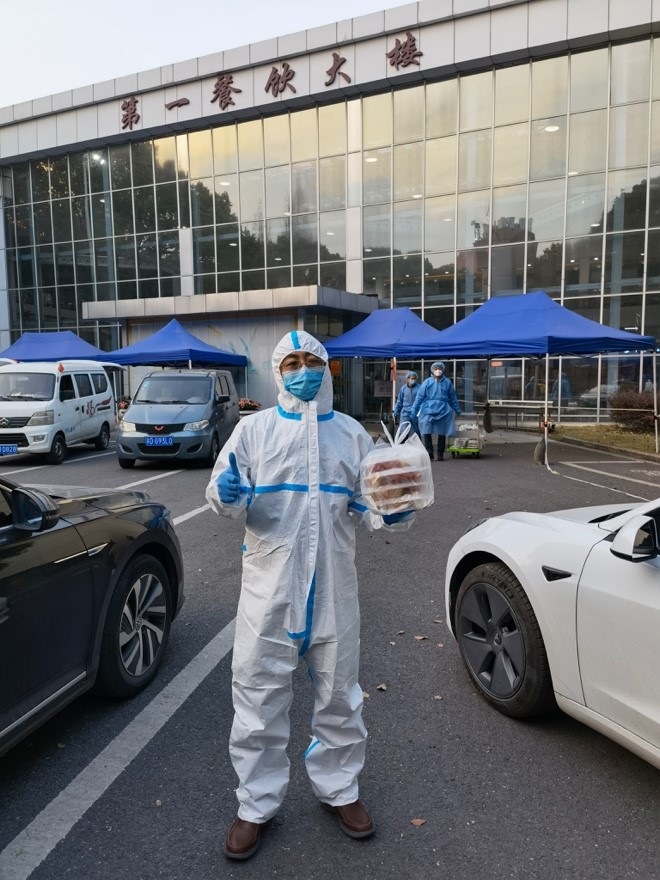 苏靖同志第一批加入了学校教职工自发组织的志愿者队伍,在学校楼栋封控管理期间,每天与学院办公室主任李伟同志以及尹君杰博士生为西54栋的同学们送上一日三餐。老师们穿着厚厚的防护服,口罩和手套,开着自己的私家车完成送餐,每次送完衣服都会被汗水浸湿,遇到雨天甚至浑身都会被雨淋透;此外,苏靖同志还加入了校核酸测试的志愿者队伍,面对学校3万多名师生的核酸测试需求,苏靖同志作为众多志愿者岗位上的一员,坚守在学校抗疫的最前线,与院办公室主任李伟同志以及学校其他学院、机关部处等同志一起,在人手不足的情况下,保障了全校师生一轮又一轮的核酸检测。