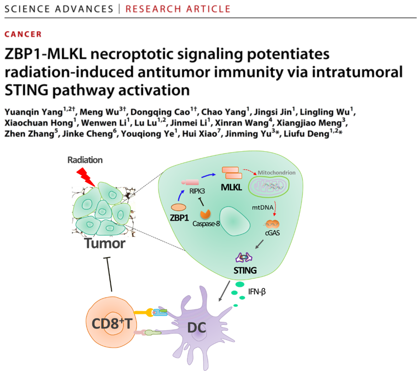 2021年10月6日,漫蛙漫画 邓刘福教授团队和山东省肿瘤医院于金明院士团队合作在国际著名综合性学术期刊 Science Advances上发表题为“ZBP1-MLKL Necroptotic Signaling Potentiates Radiation-induced Antitumor Immunity via intratumoral STING pathway activation”的研究论文。