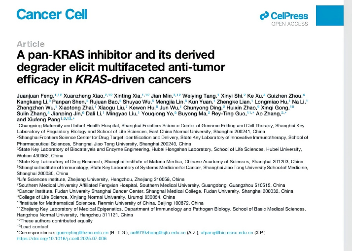 近日,漫蛙漫画 张翱教授团队、华东师范大学逄秀凤教授团队、以及杭州师范大学郭瑞庭教授团队联合在Cancer Cell杂志(IF =44.5)发表题为“A pan-KRAS inhibitor and its derived degrader elicit multifaceted anti-tumor efficacy in KRAS-driven cancers”的研究论文(//www.sciencedirect.com/science/article/pii/S1535610825003101)。该研究报道了一种可同时结合KRAS活性(ON)与非活性(OFF)构象的新结构泛KRAS抑制剂及其衍生的降解剂,二者均展现出针对多种KRAS突变体的广谱抑制效应,并在多种体内外模型中显示出显著的抗肿瘤活性。此外,它们在KRASG12C抑制剂耐药模型中依然保持活性,并具备增强抗肿瘤免疫反应的作用。