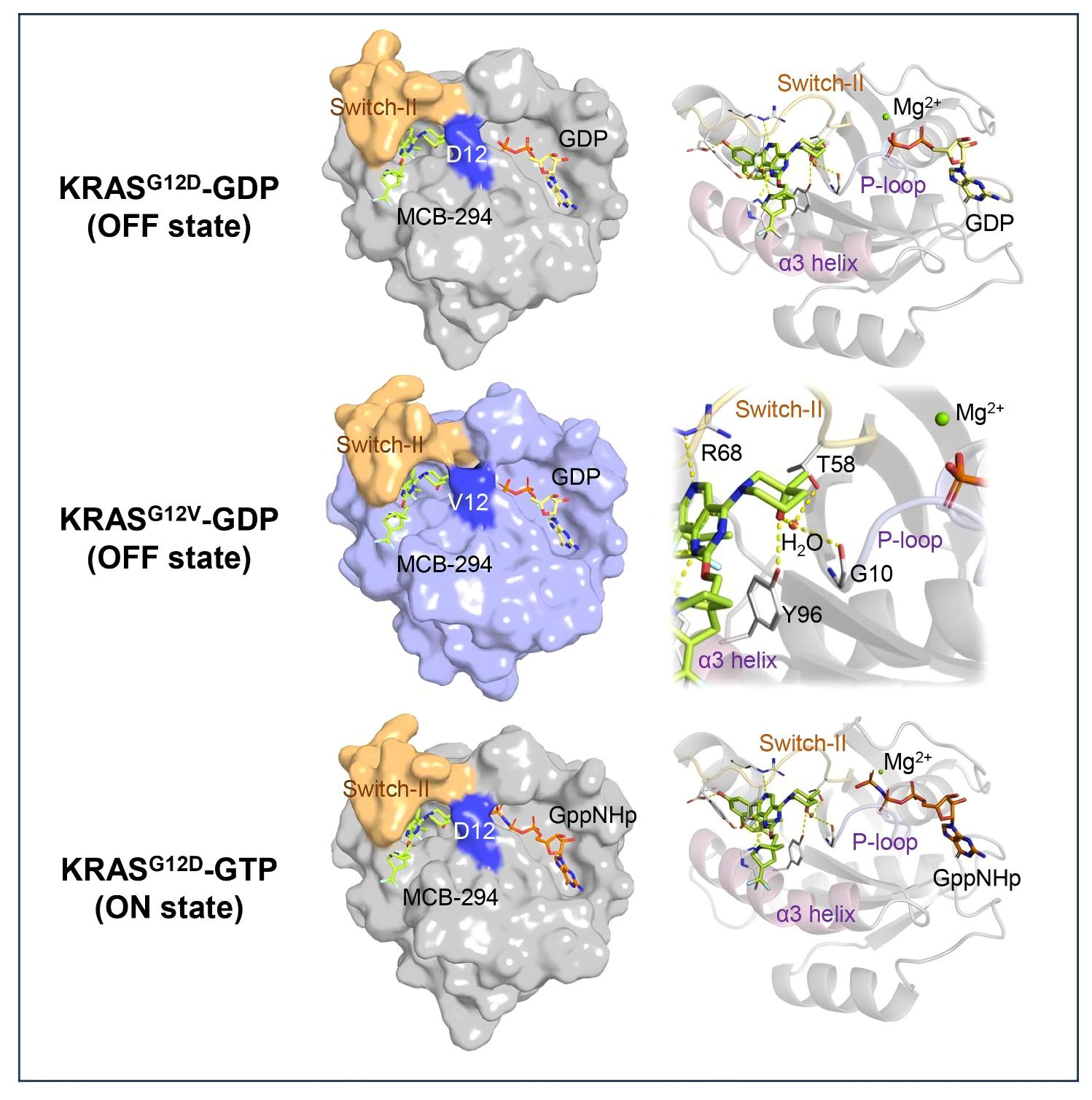 在前期开发的KRASG12D选择性抑制剂Compound 31基础上,研究团队通过结构优化,降低C4位取代基的碱性,从而削弱其对KRAS第12位天冬氨酸残基(D12)的依赖;同时引入极性基团,以增强其与KRAS蛋白保守残基的相互作用。基于上述策略,团队设计并合成了一系列具有广谱活性的泛KRAS抑制剂。其中,MCB-294表现出优异的抗肿瘤活性,能够有效抑制KRAS的核苷酸交换及其下游信号通路的激活。蛋白晶体结构解析显示,MCB-294可同时结合KRAS的活性(ON)与非活性(OFF)构象。其结构中的羟基哌啶基团可通过水分子介导的氢键网络,与P-loop区域的保守残基形成稳定相互作用,高效占据KRAS的switch-II变构口袋,从而实现对KRAS的精准靶向。该结合模式不依赖KRAS第12位氨基酸的突变类型,赋予其广谱抑制多种KRAS突变体的能力。与目前已报道的KRASG12D抑制剂MRTX1133以及仅靶向KRAS非活化(OFF)构象的泛KRAS抑制剂BI-2865相比,MCB-294能在更低有效浓度下抑制肿瘤细胞增殖及KRAS活性。