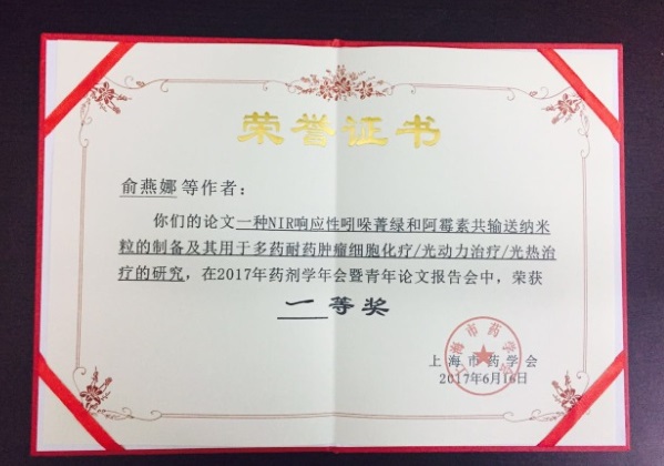 我院郭圣荣课题组硕士生俞燕娜、李方舟和朱浩的论文受到好评。俞燕娜所做的题为“一种NIR响应性吲哚菁绿和阿霉素共输送纳米粒的制备及其用于多药耐药肿瘤细胞化疗/光动力治疗/光热治疗的研究”的报告荣获一等奖,俞燕娜的硕士论文工作成果还被A档SCI学术期刊Acta Biomaterials接受发表。李方舟所做的题为“一种基于介孔纳米粒的多重刺激响应性阿霉素递释系统及其用于抗多药耐药肿瘤的研究”的报告荣获三等奖,李方舟硕士论文工作成果投稿A档SCI学术期刊CARBON, 受到评阅人好评,已俢回。朱浩的论文获鼓励奖,朱浩的硕士论文工作成果已在英国皇家化学会高水平期刊Journal of Materials Chemistry, B 发表。
