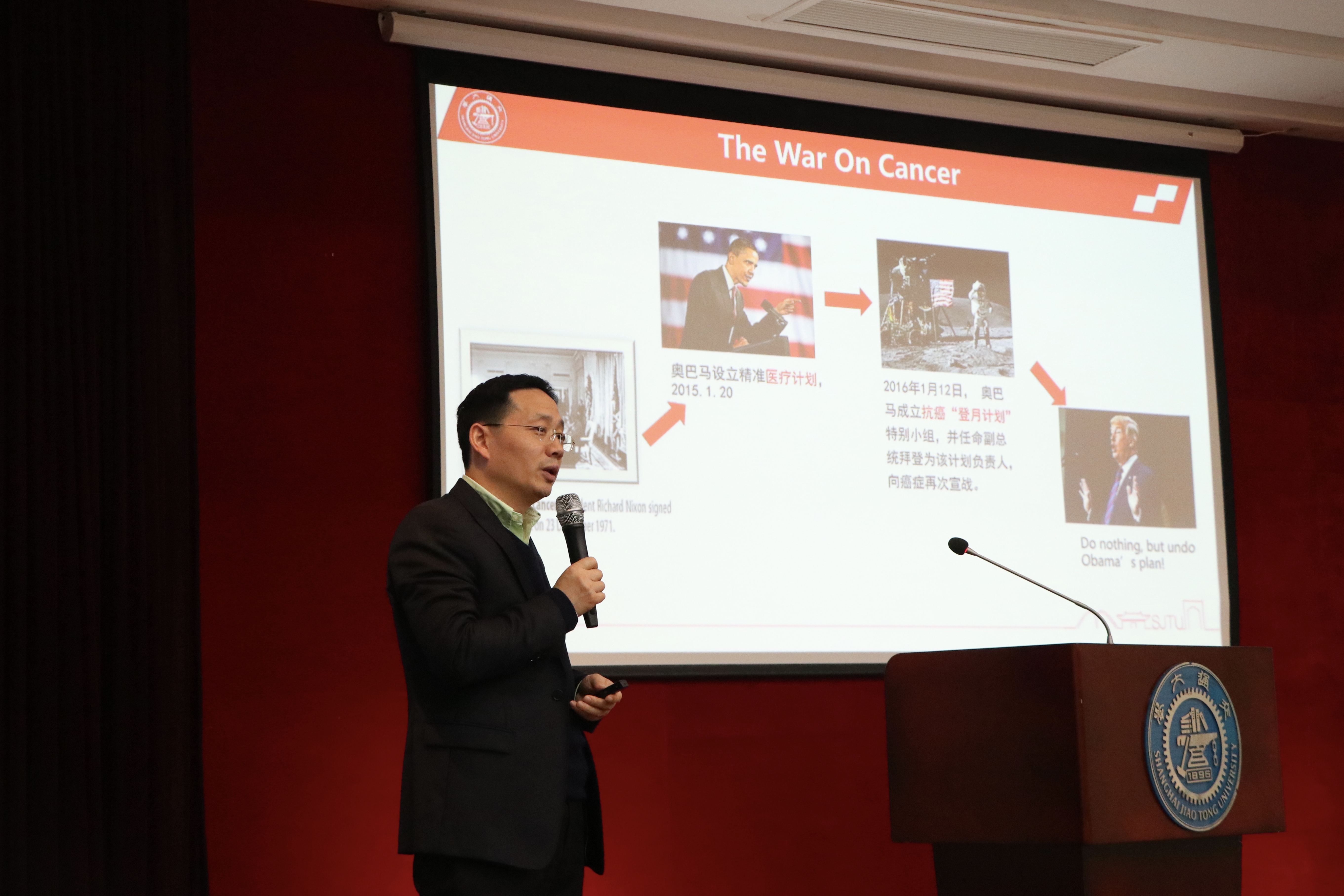 在介绍了药学整体情况后,张翱院长以过去20年人类与癌症斗争的药物研发史为例,指出药学是一门基于多学科交叉的复杂科学。在过去的20年,生物学的发展推动药学领域中的肿瘤药物研发迅速换代。人们对癌症的研究以及治疗从肿瘤组织形态逐渐细化至错综复杂的分子信号通路。从2000年开始,美国科学家提出肿瘤细胞6大特征,推动了人们对癌症的认识从细胞水平深入到分子水平,标志着靶向药物研究的开始;接下来10年里人们对肿瘤的认识扩大到十个特征,推动了对肿瘤生长增殖的更全面认识,并为靶向药物的飞速发展插上了强有力的翅膀。随后的10年,新的分子靶标不断被发现,针对靶标不同活化形式的个性化药物不断研发成功,极大的推动了抗肿瘤个性化精准治疗。如靶向BCR-ABL的小分子抑制剂——格列卫,用于治疗慢性粒细胞白血病;靶向表皮生长因子受体EGFR的吉非替尼,用于治疗EGFR突变的非小细胞肺癌;靶向间变性淋巴瘤激酶ALK的小分子抑制剂克唑替尼,用于治疗ALK阳性的局部晚期或转移性肺癌患者;靶向BRAF激酶V600E突变的威罗菲尼,用于治疗BRAF阳性的黑色素瘤,等等。