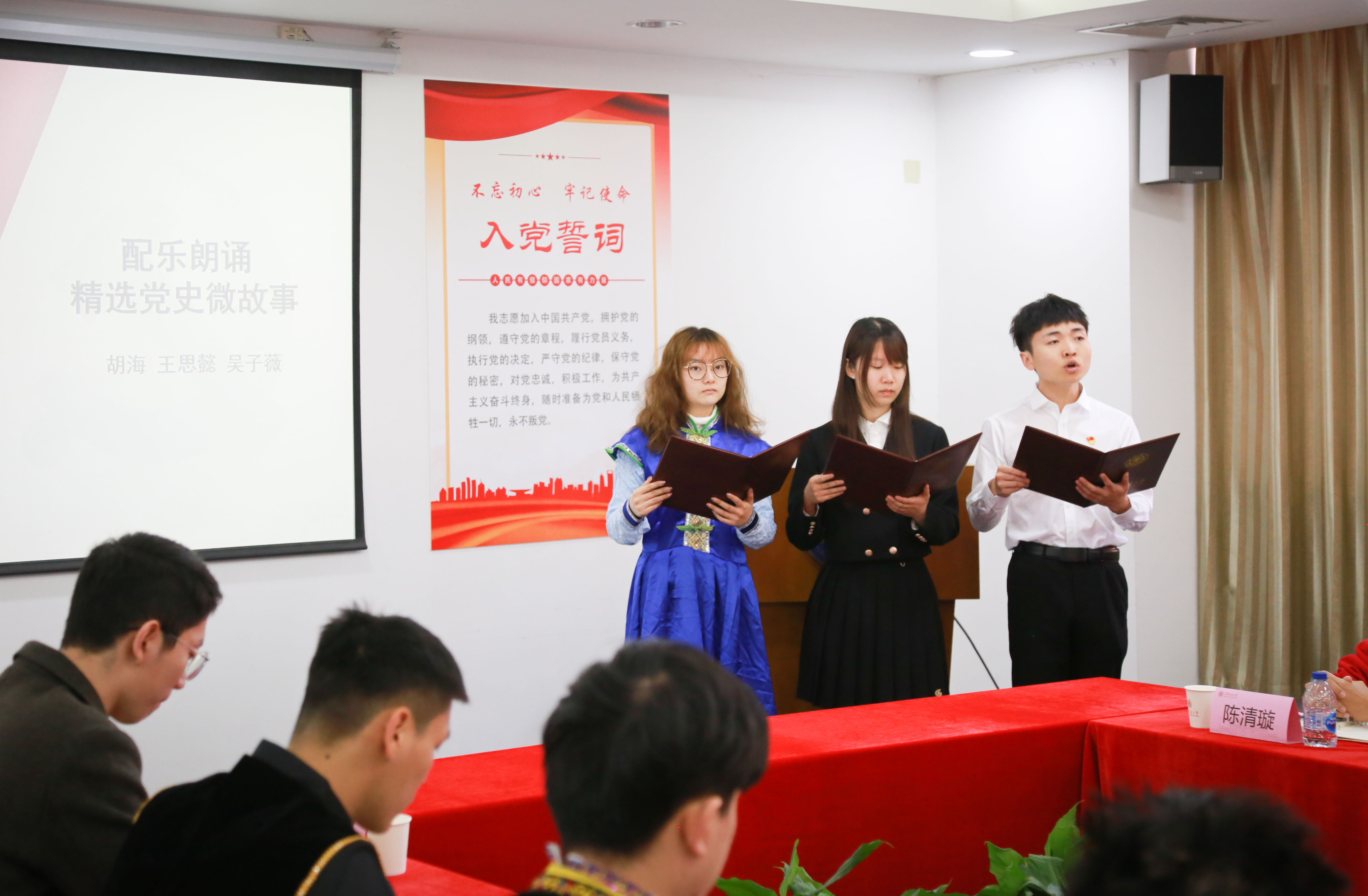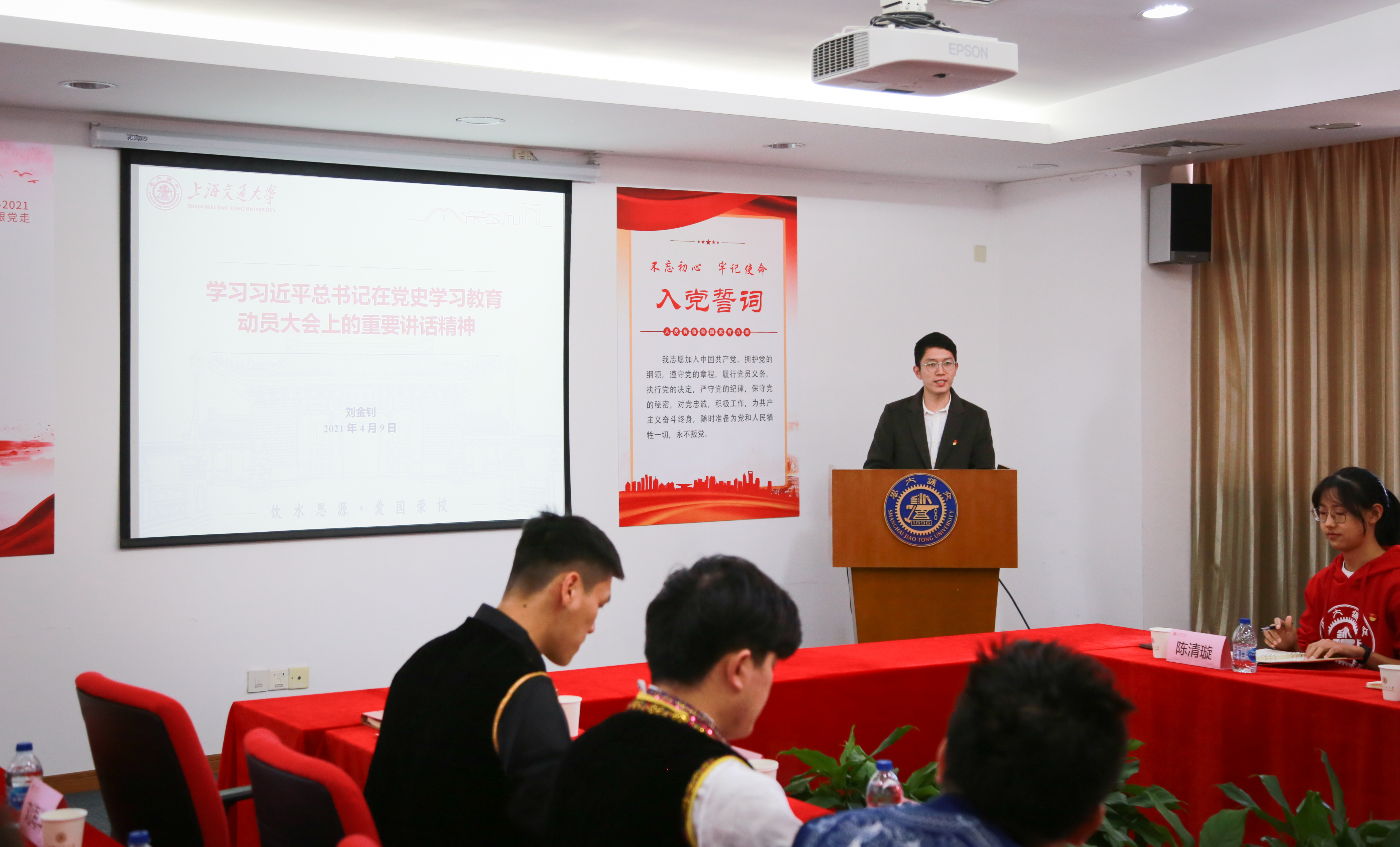 支部刘金钊同志从重要意义、重点内容、工作要求三个方面,带领大家集体学习了习近平总书记在党史学习教育动员大会上的重要讲话精神,并畅谈了个人的学习体会。胡海、王思懿、吴紫薇(蒙古族)三位同志分别配乐朗诵了《茅坪写春联》《布袋里的口粮》《天坑开路人》等3个党史故事,讲述了我们党不同时期的典型事例、历史人物和难忘记忆。周奚焱(白族)、袁心怡、吴志豪(回族)、蒋斌诚(佤族)、陈清璇五位同学分享了自己的入党故事,讲述了自己的入党初心。周奚焱谈到,他入党的种子是由家人播种,在党的光辉下,他的父亲从一个贫苦的少数民族少年成长为一个基层领导干部;求学期间,他们兄弟的家长会父亲只去了3次,但工作却从未缺席。袁心怡讲述了自己外公外婆在前哨农场插队落户的故事,提到在外公外婆的影响下,她从小就对党怀有强烈的敬意,立志成为家中第一名光荣的党员。吴志豪提到,入党,是因为那份还不完的恩情;他自己是党对少数民族地区教育关怀帮扶政策的受益者,亦是新疆这些年来脱贫攻坚发生沧海桑田之变的见证者。蒋斌诚说到,回想自己的入党故事,其实也是个人成长的蜕变故事;通过不断向身边优秀党员同志学习,在党组织的教育、培养下,他收获了成长,从一个“后进生”转变为校“三好学生标兵”。陈清璇谈到,自己坚定的入党志愿植根于她对中国这片土地的热爱,强调要用党的理论武装自己,用行动书写对这片土地的爱。