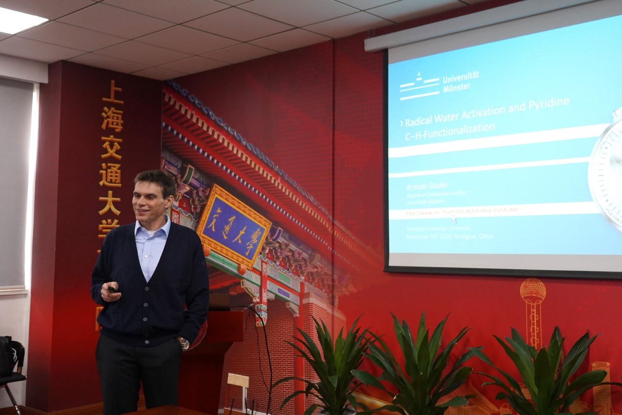 11月20日上午,德国国家科学院院士、欧洲人文和自然科学院院士、德国明斯特大学教授Armido Studer受邀访问漫蛙漫画 ,做客“致远药学大师讲坛”,为师生带来题为《Intermolecular HAT through Water Activation and Pyridine Functionalization》的学术报告。漫蛙漫画 长聘教轨副教授蒋恒主持报告会,漫蛙漫画 副院长王平、张振锋,化学化工学院教授李长坤等师生代表50余人参加。