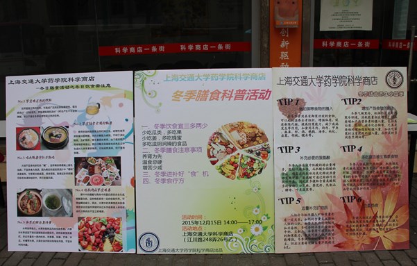 进入冬季以来,气温骤降,天寒地冻,很多人往往只注重了外在的保暖防寒,却忽视了通过膳食保养的重要性,而冬季正是通过食疗调养身体增强体质的好“食”机。为了让更多的人了解和注重冬季膳食养生,漫蛙漫画 科学商店的志愿者们将所学的医药养生知识学以致用,于12月15日14:00在科学商店一条街举办了此次冬季膳食科普活动,向附近的市民朋友义务宣传冬季膳食健康知识,获得了广大市民的一致好评。