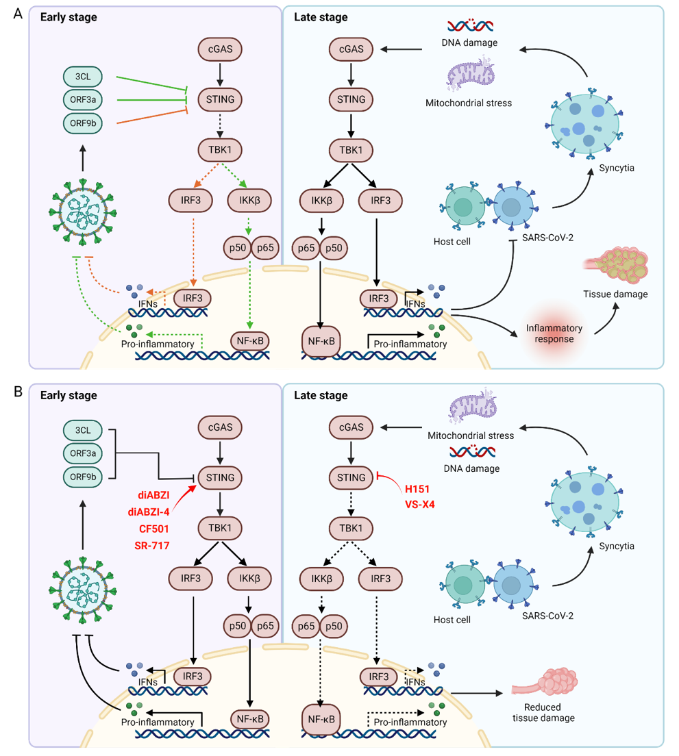 SARS-CoV-2病毒与STING信号通路间的关系紧密而复杂,在新冠感染初期,病毒通过自身蛋白与STING的直接结合抑制STING通路的激活,减弱宿主的天然免疫响应,为病毒的复制提供时间。随着感染进程的发展,宿主体内病毒数量逐渐增加,病毒与宿主细胞融合形成合胞体,其中的微核由于基因组不稳定,激活STING通路介导炎症响应,在对病毒进行一定杀伤的同时,过度的免疫反应也会导致严重的肺部炎症和并发症。因此,STING激动剂或抑制剂有希望应用于SARS-CoV-2病毒的防治,例如在感染早期使用STING激动剂以激活机体内的天然免疫响应杀伤病毒抑制其复制,在感染中晚期使用STING抑制剂减弱机体的过度免疫响应,减少肺部炎症(图1)。但STING调节剂在新冠防治中的具体应用仍需进一步研究,包括具体的用药时机以及用药标准等,该文章提出或可根据患者体内干扰素响应水平判断应采用STING激动剂或抑制剂。目前,张翱团队正在进行相应的靶向STING通路的激动剂(J. Med. Chem. 2021, 64,1649-1669.)和拮抗剂研究(J. Med. Chem. 2021, 64, 7667-7690.)。