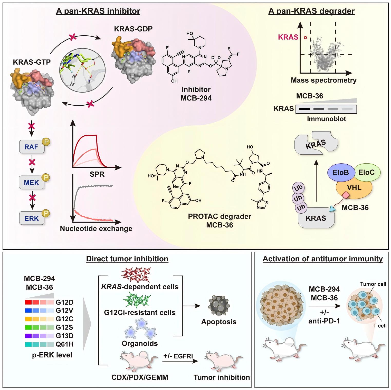 无论是泛KRAS抑制剂MCB-294,还是KRAS降解剂MCB-36,均在多种KRAS突变型肿瘤细胞系、类器官和动物模型中展现出显著的抗肿瘤活性。更重要的是,在KRASG12C抑制剂耐药的肿瘤模型中,MCB-294和MCB-36仍保持有效的抗肿瘤细胞生长效应,显示出克服现有疗法耐药性的潜力。此外,这两种化合物还可进一步激活抗肿瘤免疫反应,改善免疫微环境,并与免疫检查点抑制剂协同发挥抗肿瘤作用。在动物模型中,MCB-294相较于MCB-36展现出更优的抗肿瘤活性;然而在体外细胞实验中,得益于MCB-36对KRAS蛋白的有效降解,其表现出更持久的KRAS信号抑制作用。为了推动临床转化,基于MCB-294和MCB-36类药性的进一步优化正在进行中。