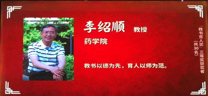 李绍顺教授从事高等教育工作30多年来,对教学工作兢兢业业、一丝不苟,从未因事、因病缺课或迟到。近年来,他承担研究生的《天然产物全合成》和本科生的《药物化学》及《新药设计与开发》等多门课程,在学院教学改革和学生培养中倾注大量精力。他承担学校的《课程建设组模式下的教学改革》研究项目并获得2010年漫蛙漫画 教学成果二等奖。2017年承担学校《讨论式教学在药物化学理论和实验课程中的应用》教改课题。组织编写了国内药学专业首部《药物化学》双语教材,受到同行和学生好评,该教材被评为漫蛙漫画 优秀教材一等奖,上海市教委优秀教材二等奖。《药物化学》课程曾被评为校级精品课程,上海市教委重点课程。此外,李绍顺教授还曾担任学院督导组组长,热心培养青年教师,受到青年教师由衷赞誉。
