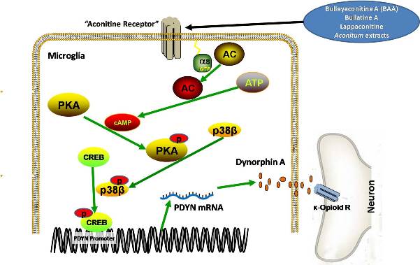 在王永祥教授指导下,李腾飞博士、黄茜博士和孙明丽硕士采用疼痛动物模型、化学生物学、基因沉默和免疫荧光染色等技术,证明乌头生物碱可有效治疗神经病理性疼痛、骨癌疼痛、类风湿性关节炎疼痛和糖尿病疼痛。乌头生物碱镇痛作用系由脊髓背角小胶质细胞释放内源性吗啡样肽-强啡肽所介导,后者作用于胶质细胞-神经元突触后神经元上κ-阿片受体产生镇痛效应,而与钠离子通道的相互作用无关。进一步研究表明,乌头生物碱通过Gs/cAMP/PKA/p38β/CREB信号转导通路释放强啡肽,进而推测乌头生物碱的作用靶点分子为小胶质细胞膜上Gs-蛋白偶联受体,并将其命名为“乌头碱受体”。