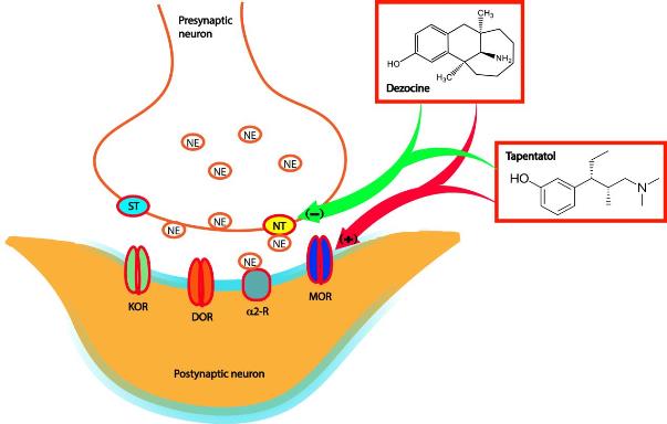 与此相反,王永祥教授团队采用疼痛动物模型、化学生物学和基因沉默等技术研究发现,地佐辛镇痛作用完全由MOR-NRI介导,即通过激动脊髓μ-阿片受体(占60%)和抑制去甲肾上腺素重摄取(占40%),而不涉及其他药理学机制,包括激动脊髓κ-阿片受体或δ-阿片受体及抑制5-羟色胺重摄取。此外,抑制脊髓去甲肾上腺素重摄取被证明与地佐辛产生较少的镇痛耐受作用有关。有趣的是,美国9年前上市的他喷他多也通过MOR-NRI产生镇痛作用,公认是MOR-NRI这一新镇痛药类别的第一个上市药物。显然,上市已27年之久的地佐辛应是第一个MOR-NRI (first in class),尽管其镇痛作用机制刚刚被阐明。