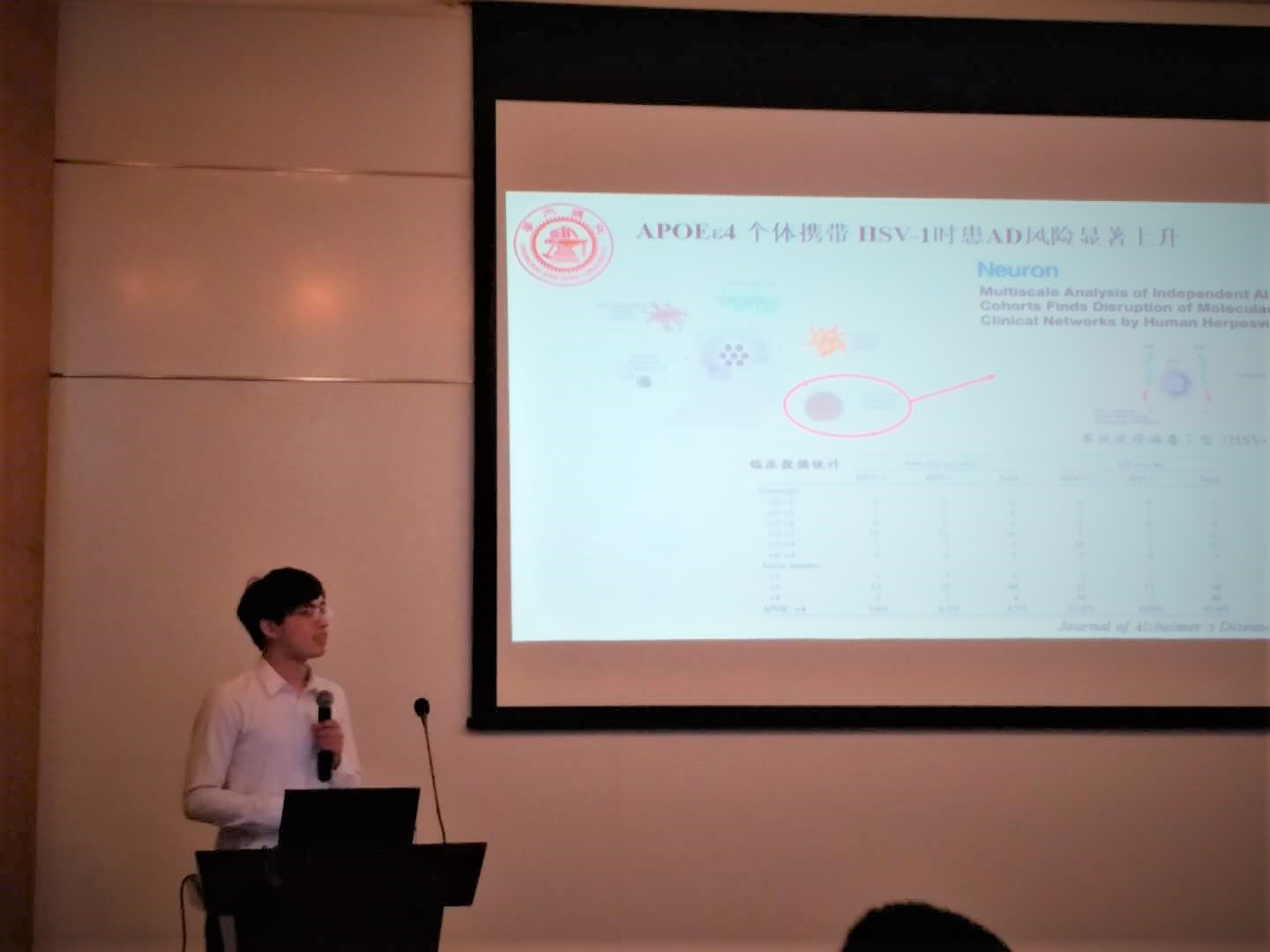 此次青年论文报告有来自漫蛙漫画 、交大医学院、复旦漫蛙漫画 、华东理工大学漫蛙漫画 、同济大学医学院、海军军医大学漫蛙漫画 等上海优秀高校和研究所的12位汇报人。经过4个多小时的学术报告,我院殷明老师课题组研究生高金超(导师:赵文娟)汇报的论文《载脂蛋白E4促进单纯疱疹病毒I型感染导致脑内Aβ沉积的神经免疫学机制》荣获优秀论文特等奖。阿尔茨海默病是高发于65 岁以上人群的神经退行性疾病,其病因和发病机制目前仍不清楚。APOE4是目前公认的散发性AD的高风险遗传因素。最近的研究发现,APOE4等位基因携带者是微生物感染导致AD发病的易感人群,包括HSV-1在内的微生物感染与APOE4等位基因两种因素的共同作用是散发性AD发病的主要原因。高金超等应用HSV-1分别经鼻感染不同基因型的APOE -TR小鼠,发现POE4促进HSV-1经鼻感染引起的脑组织内HSV-1扩增并导致脑内Aβ沉积,其机制与促进小胶质细胞分泌炎症因子及减弱CD1和NK T细胞参与的免疫应答异常有关,首次揭示载脂蛋白E4促进单纯疱疹病毒I型感染导致脑内Aβ沉积的神经免疫学机制。