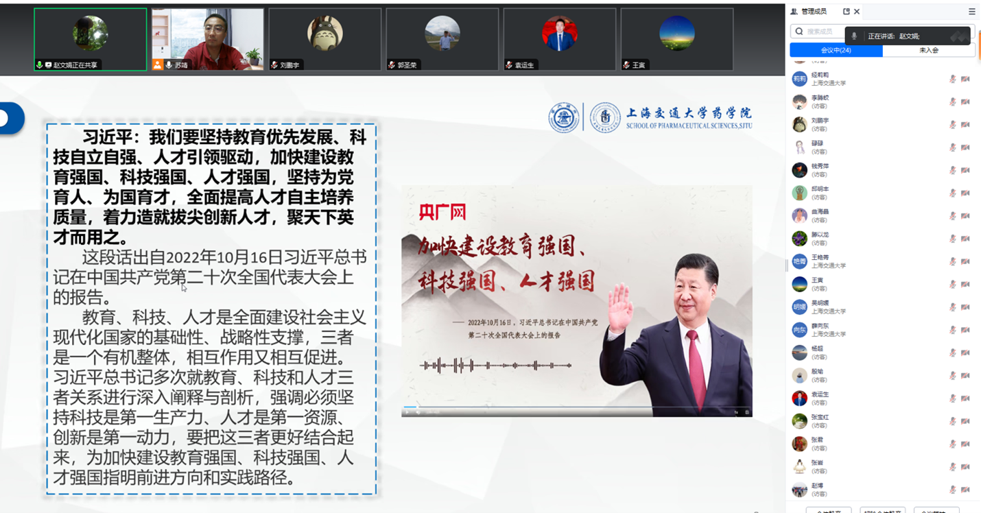 赵文娟领学习近平总书记关于教育、科技、人才的重要论述,对高校工作以及本专业、本学科、本领域的重要讲话和重要指示批示精神。支部党员认真学习领会了习近平总书记关于加快建设教育强国、科技强国和人才强国方面的重要指示,以及习近平总书记在清华大学、中国人民大学、北京大学、南开大学、哈尔滨工业大学和厦门大学的讲话或贺信内容。
